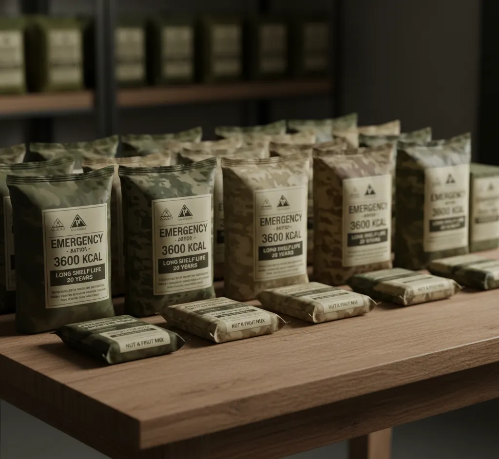 Military-style complete meals. Heavy, long shelf life, self-heating options available. Functional but expensive and not particularly pleasant.